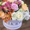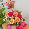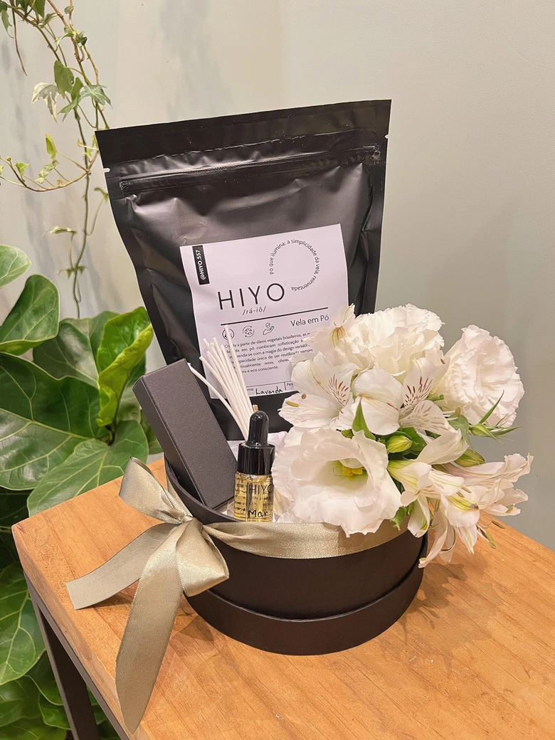 Em uma box um delicado buque de astromelias, contem um pacote com 500 gramas de vela em pó, uma essencia aromatizadora, e pavios, acompanha também um laço.