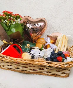 Essa cesta vai embalada em plástico celofane e um lindo laço de cetim.