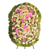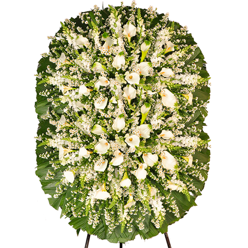 Coroa de flores da linha Luxo, com flores do campo brancas. Envie sua mais bela homenagem póstuma e votos de conforto e condolências. Medidas aproximadas de 1,60m por 1,20m.