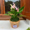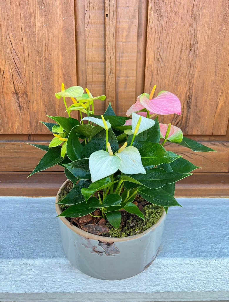 Em um cachepo de ceramica, anturios coloridos foram um lindo jardim.